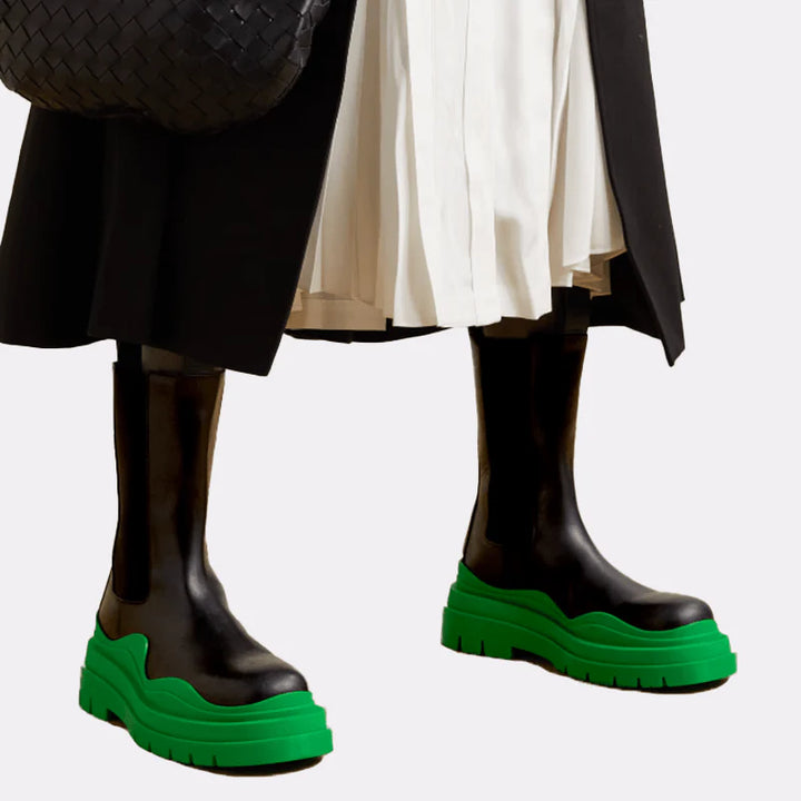These Chelsea boots are crafted from premium vegetable-tanned calf leather, offering a sustainable yet stylish option. Featuring a sleek black and blaster color combination, they come with a durable rubber outsole and a 50mm flatform. Designed for a comfortable fit.
