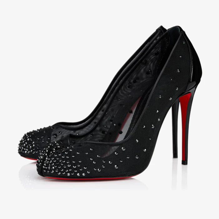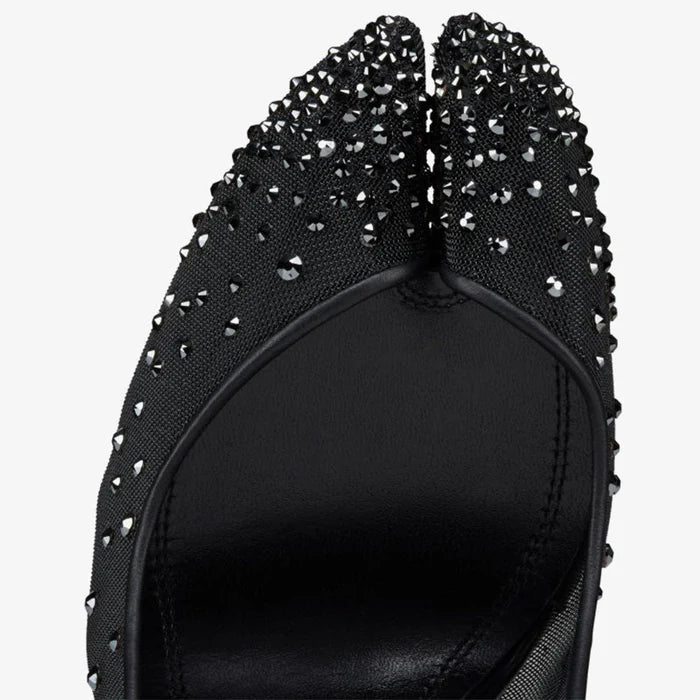 This elegant pump features the iconic Split-toe shape, crafted from sheer black mesh paired with contrasting patent calf leather. Adorned with a gradation of rhinestones, it offers a touch of sparkle while sitting on a 100mm stiletto heel. The perfect balance of sophistication and bold design, these pumps are sure to make a statement.