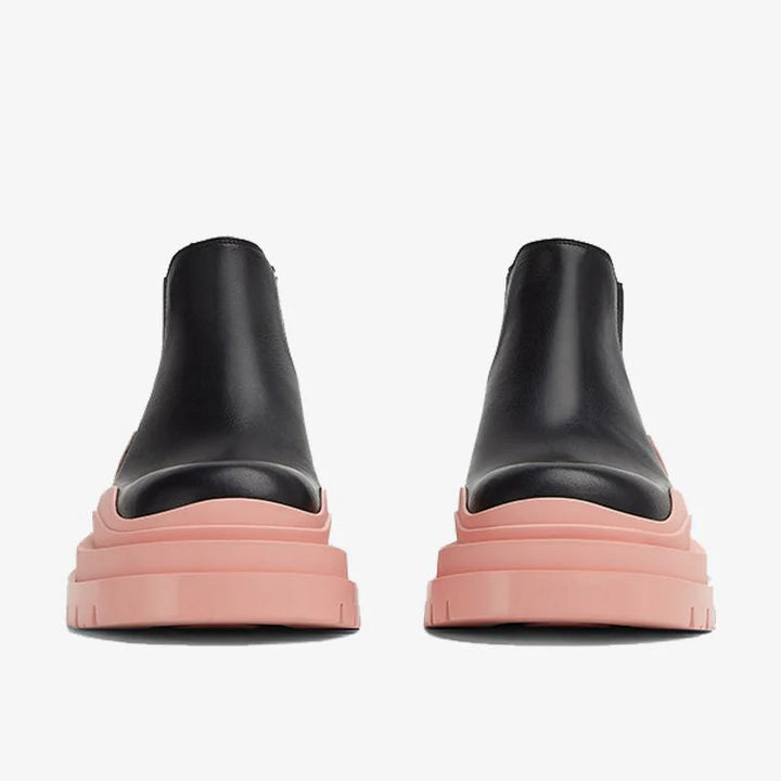 These cropped Chelsea boots are crafted from premium vegetable-tanned calfskin, showcasing a chic black and peachy color combination. With a 50mm flatform and sturdy rubber outsole, they offer both style and comfort. Please note, the boots fit large, so it's recommended to take one size smaller.