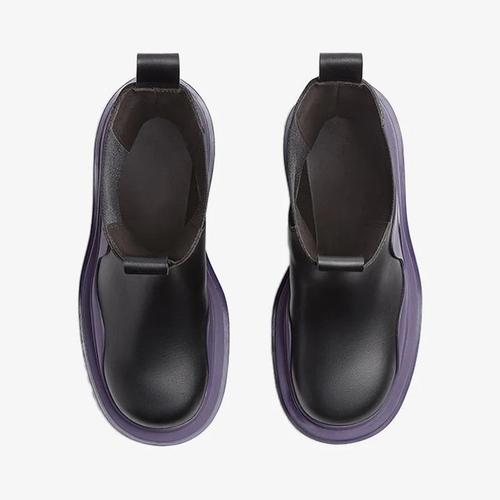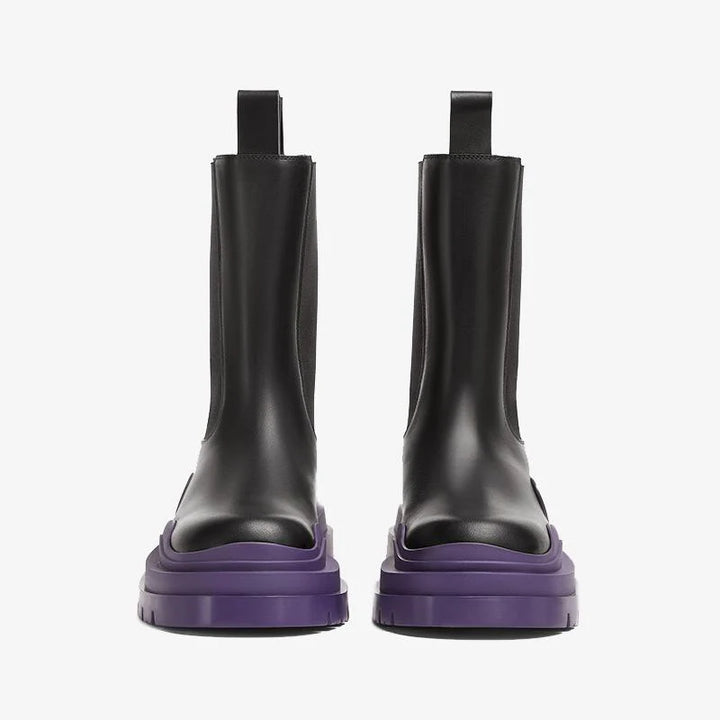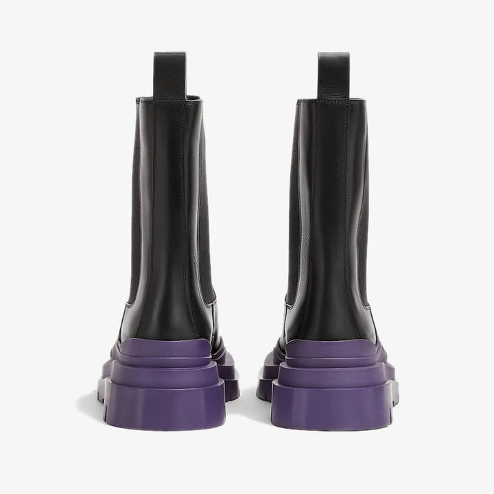 These vegetable-tanned leather Chelsea boots combine elegance and comfort with their rich black and purple color combination. Featuring a durable rubber outsole and a 50mm flatform for added height and style, they are a perfect blend of classic and contemporary design.