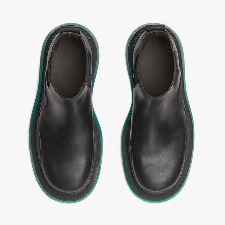 These vegetable-tanned leather cropped Chelsea boots are crafted with a unique black and green color combination. Featuring a 50mm flatform and a durable rubber outsole, they provide a perfect blend of comfort and style.
