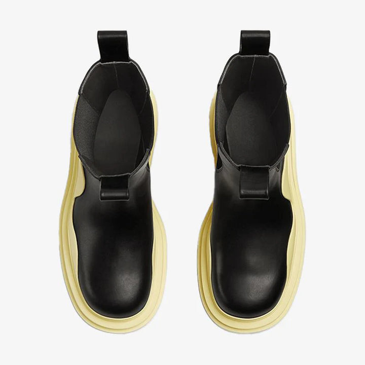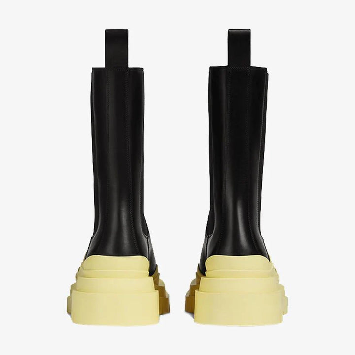 These Chelsea boots are crafted from 100% vegetable-tanned calfskin in a striking black and lemonade color combination. They feature a 50mm flatform rubber outsole for modern appeal, while the classic elastic inserts and calf leather lining ensure comfort and easy wear.