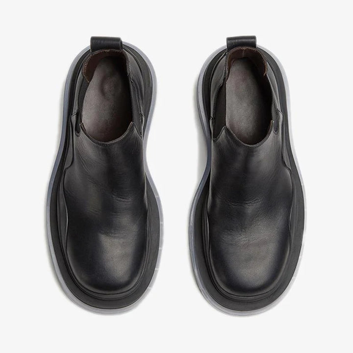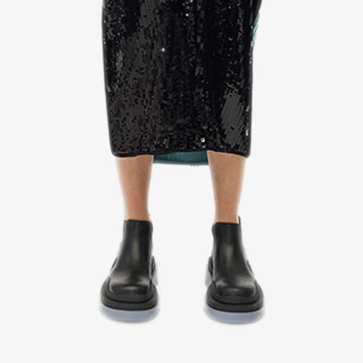 These cropped Chelsea boots are made from vegetable-tanned calf leather, offering a natural and eco-conscious style. Featuring a rubber outsole for traction and a 50mm flatform for added height and comfort, these boots combine practicality with sleek design. The calfskin lining adds a luxurious touch, while the unique black and transparent color combination makes them a statement piece.