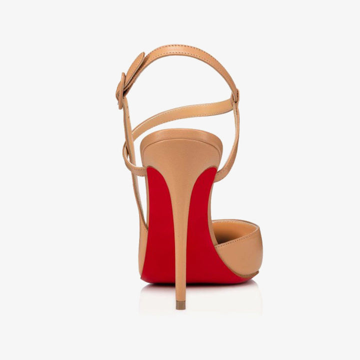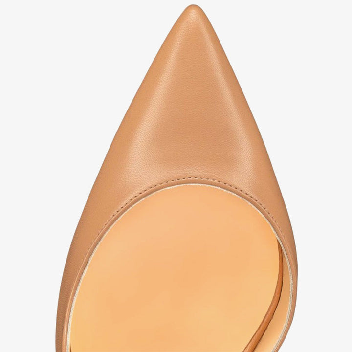 The pump is designed entirely in nude leather, featuring a tapered pointed upper that accentuates the foot with a deep, elegant cut. This daring model is set on a 100 mm heel and envelops the ankle with a set of thin crossed straps. Enhanced with discreet finishes, it stands out for its refined silhouette and sophisticated appeal.