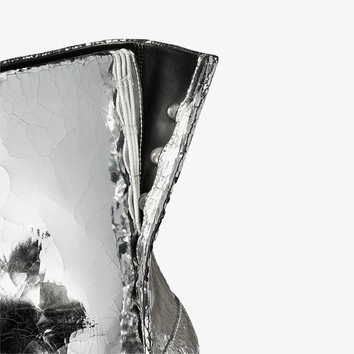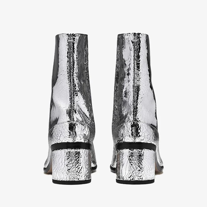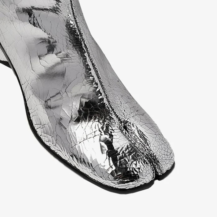 These striking boots feature a unique broken mirror finish and the iconic split-toe design, complemented by a bold cylindrical heel. Crafted from premium calf leather, they showcase white stitching at the back and a convenient hook closure. This avant-garde piece embodies a heritage classic, continually redefining style with each collection. Perfect for those looking to make a statement. It sits on a 60 mm heel.