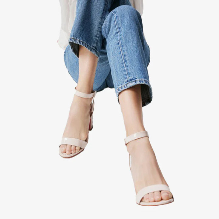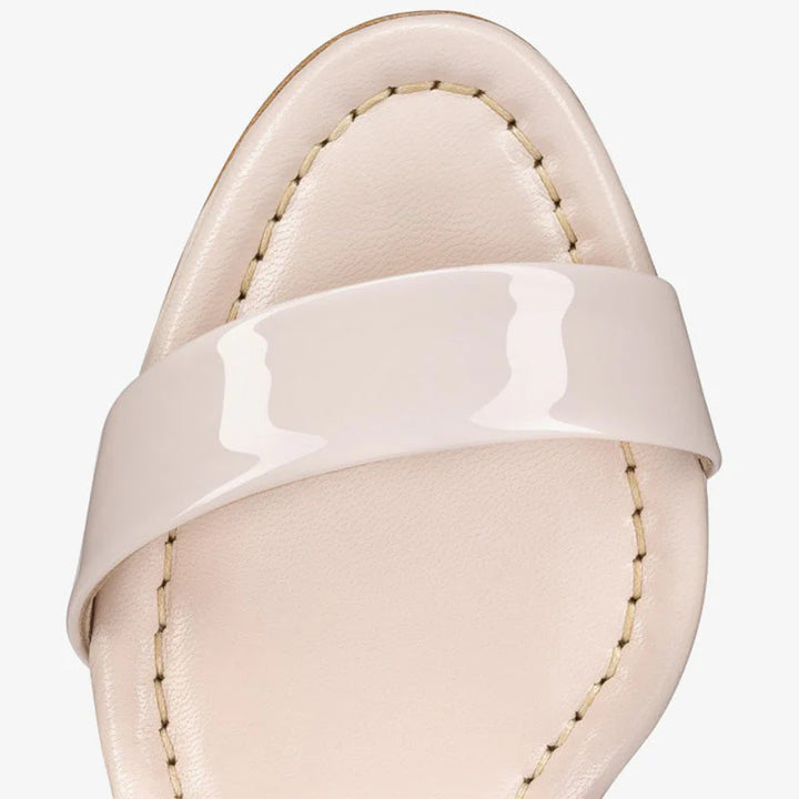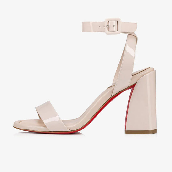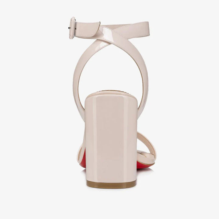 The iconic sandal returns with its signature curvy silhouette and an elegant approximately 80 mm heel. Crafted in glossy beige patent calf leather, it features a graceful strap across the toe and another that winds around the ankle, fastening with a delicate buckle. The iconic red sole adds a striking contrast, making this design ideal for both daytime elegance and evening charm.
