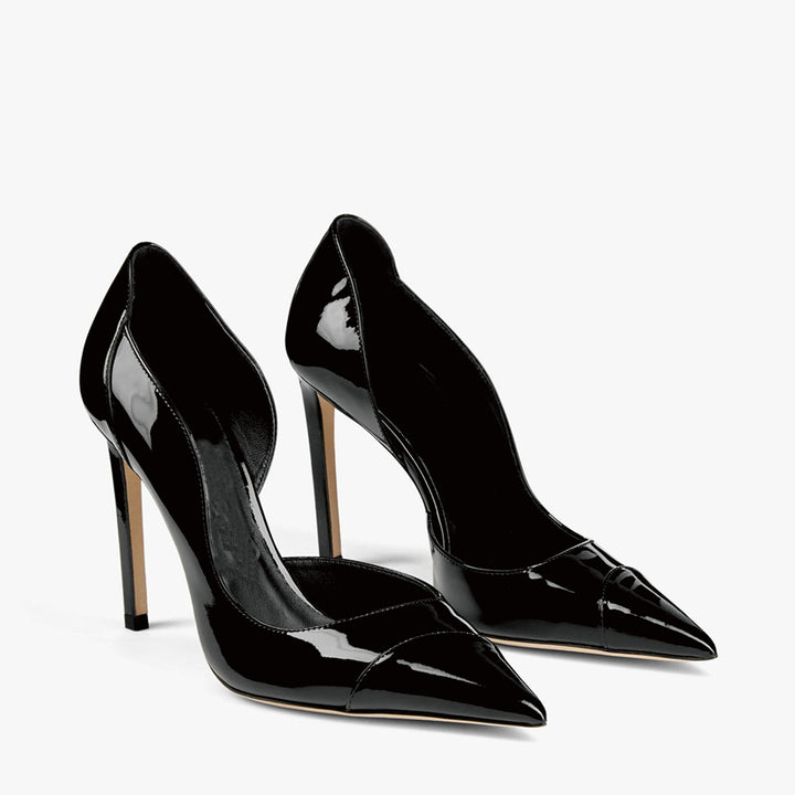 Crafted in glossy patent leather, the Brigitte pumps are shaped with signature curvature to a sleek pointed toe and structured with a high-cut vamp that contours the foot. The 100mm stiletto heel elongates the silhouette, while the distinctive stitched band across the toe adds definition.