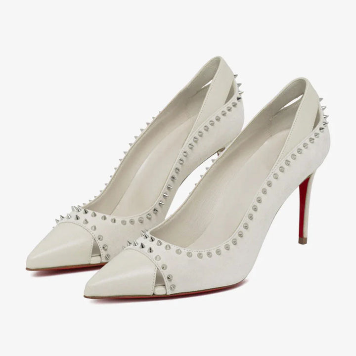 This sophisticated pump features elegant lines, a pointed toe, and tonal spikes for a touch of edge. Crafted from black velours and nappa leather, it is set on an 80 mm heel and includes a discreet notch at the back. A refined choice for a bold statement.