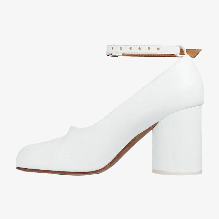 These pumps are crafted from soft nappa leather and feature the signature Split-toe design. With an adjustable ankle strap and an 80mm cylindrical heel, they offer a sophisticated, comfortable fit. The white stitching at the back adds a subtle touch of detail.