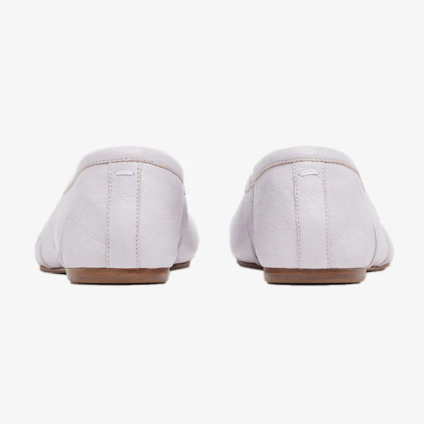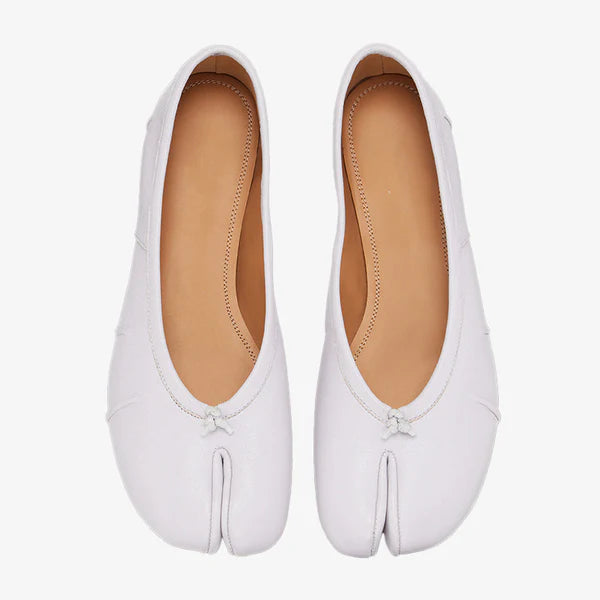 The Split-toe new ballerinas are crafted from soft calf leather and feature a distinctive handcrafted worn treatment applied to the folds, base, and seams, resulting in an artisanal vintage effect. The shoes are designed with the signature Split-toe, a nod to traditional Japanese footwear. A cotton knot at the front adds a unique touch, while the white stitching at the back enhances the timeless appeal of these ballerina shoes.