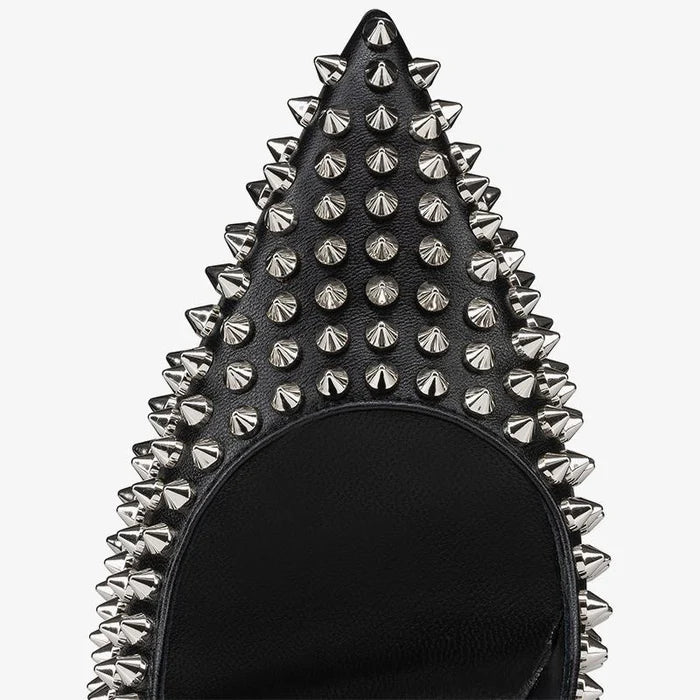 Elevate your look with these sleek black leather pumps. Featuring a pointed toe and a daring low-cut vamp that highlights the foot, they come with a 100 mm slanted heel and signature metal spikes for a bold, creative touch.