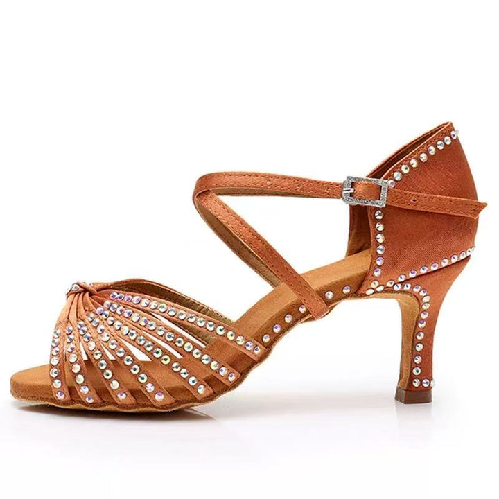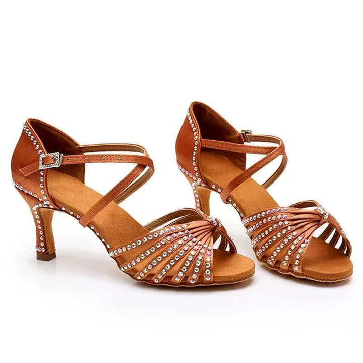 Women's Rhinestone-Embellished Tan Latin Dance Shoes - High Heel Ballroom Dance Sandals with Buckle Strap